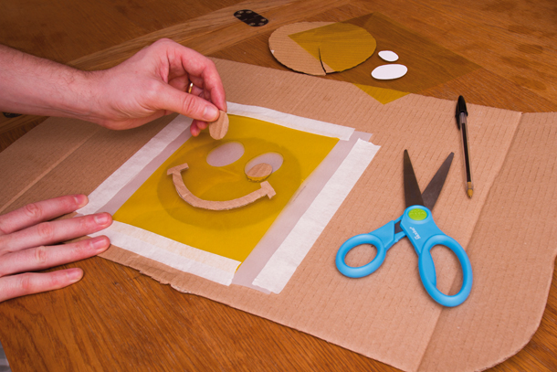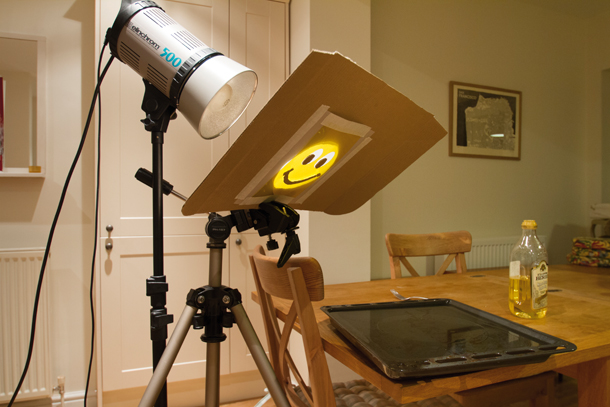 في هذه التجربة قمنا بعمل قالب وجه مبتسم , لاكن يمكنك عمل قوالب اخري ( قلوب , ازهار , نجوم , الخ … ) واختيار اي مصدر ضوء مناسب .