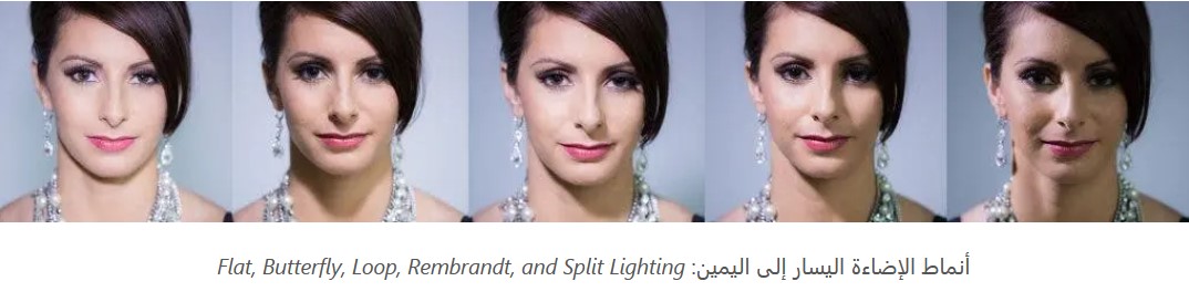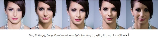 - الإضاءة: هناك خمسة أنماط إضاءة أساسية يجب أن تكون على دراية بها ، وكل منها يبدو مختلفًا بشكل ملحوظ عن الأنماط الأخرى. تتضمن هذه الأنماط flat, butterfly, loop, Rembrandt, and split lighting ، والإضاءة المنقسمة.