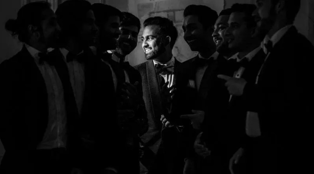 - العمق: استخدام رفقاء العريس كعناصر أمامية يخلق عمقًا ، وطريقة وضعهم تساعد في تأطير العريس. كما أن عمق المجال السطحي، الذي يمكنك الحصول عليه من خلال عدسة رئيسية بفتحة واسعة ، يعزز هذا التأثير أيضًا.