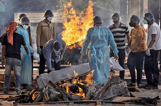 طبعًا ده كان قبل ما المستشفيات نفسها تقفل أبوابها قدام المرضى، عشان خلاص مبقاش عندهم سراير ولا أجهزة تنفس تكفي كل ده.. وبالتالي الناس بقت بتموت في أي حتة.. في الشوارع والبيوت وعلى السراير وهما مستنيين فرصتهم على جهاز أكسجين.. وكمية الجثث بقت تستدعي إنهم يتم حرقهم ف محرقات جماعية Mass Cremations زي ما أنت شايف في الصور كده