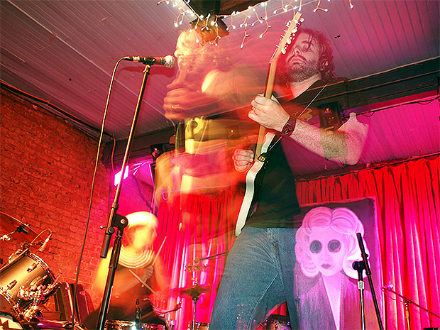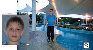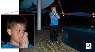 تظهر وضعية التزامن البطيء Slow Sync للفلاش الخلفيات بينما يقوم الفلاش ضمن الوضعيات العادية بإظهار الخلفية معتمة، في هذه الحالة يفضل استخدام حامل للكاميرا لتثبيتها كي لا يظهر أثر الحركة الناتج عن سرعة الغالق البطيئة كما في الصورةحيث يبدو أثر الحركة واضحاً في تكبير جزء من الصورة (الوجه).